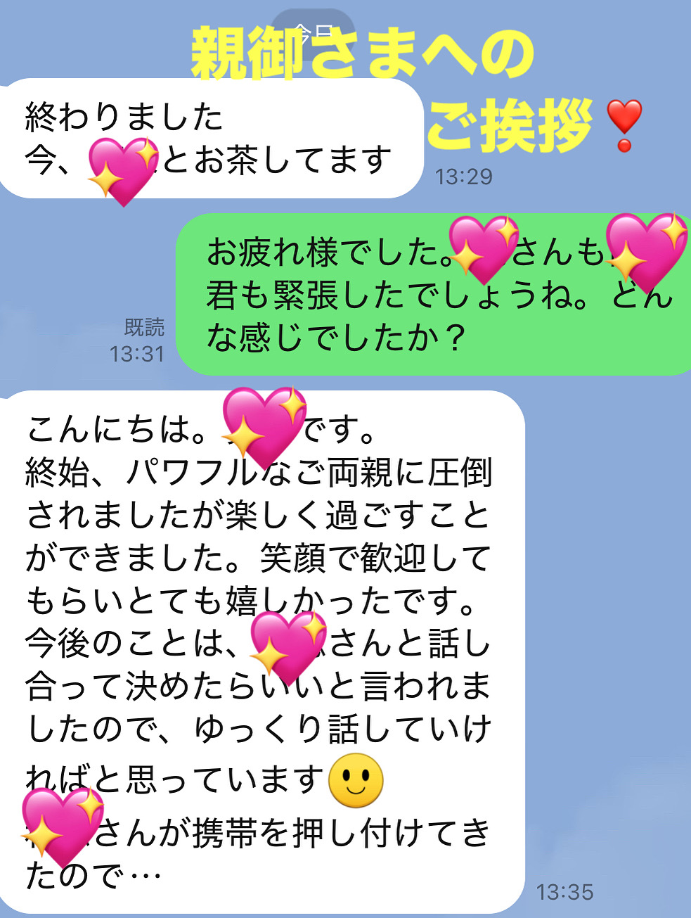 今日、親御さまへのご挨拶に行ったシンシアリーの男性会員さまとお相手。