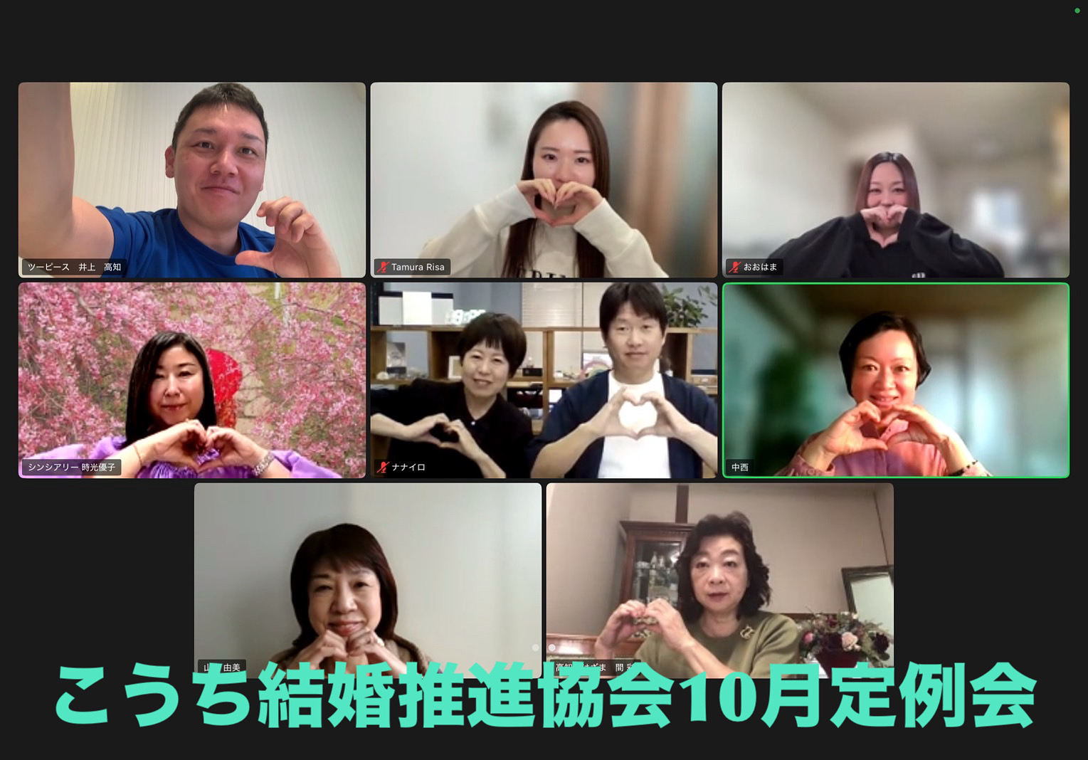 オンラインなので、関西からも参加。7社9人の仲人が参加して、高知県の恋しよの会員さまと成婚第一号がでたGOENプランニングの山本さんからの話に始まり、高知の結婚相談所事情を共有。
