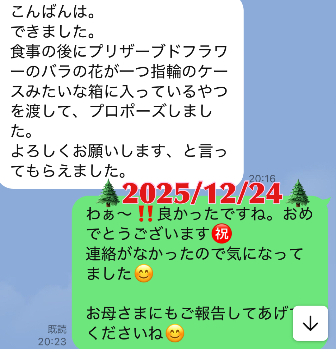 翌日になっても連絡が無いので、もしかしてプロポーズできなかったのか💦💦💦とドキドキしましたが、無事成功❣️❣️❣️