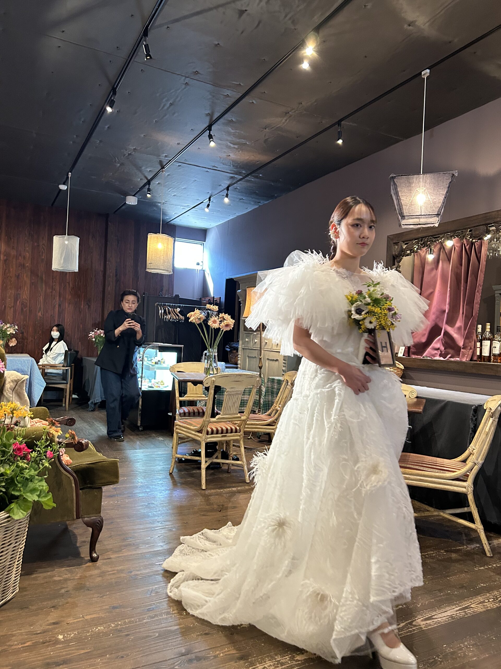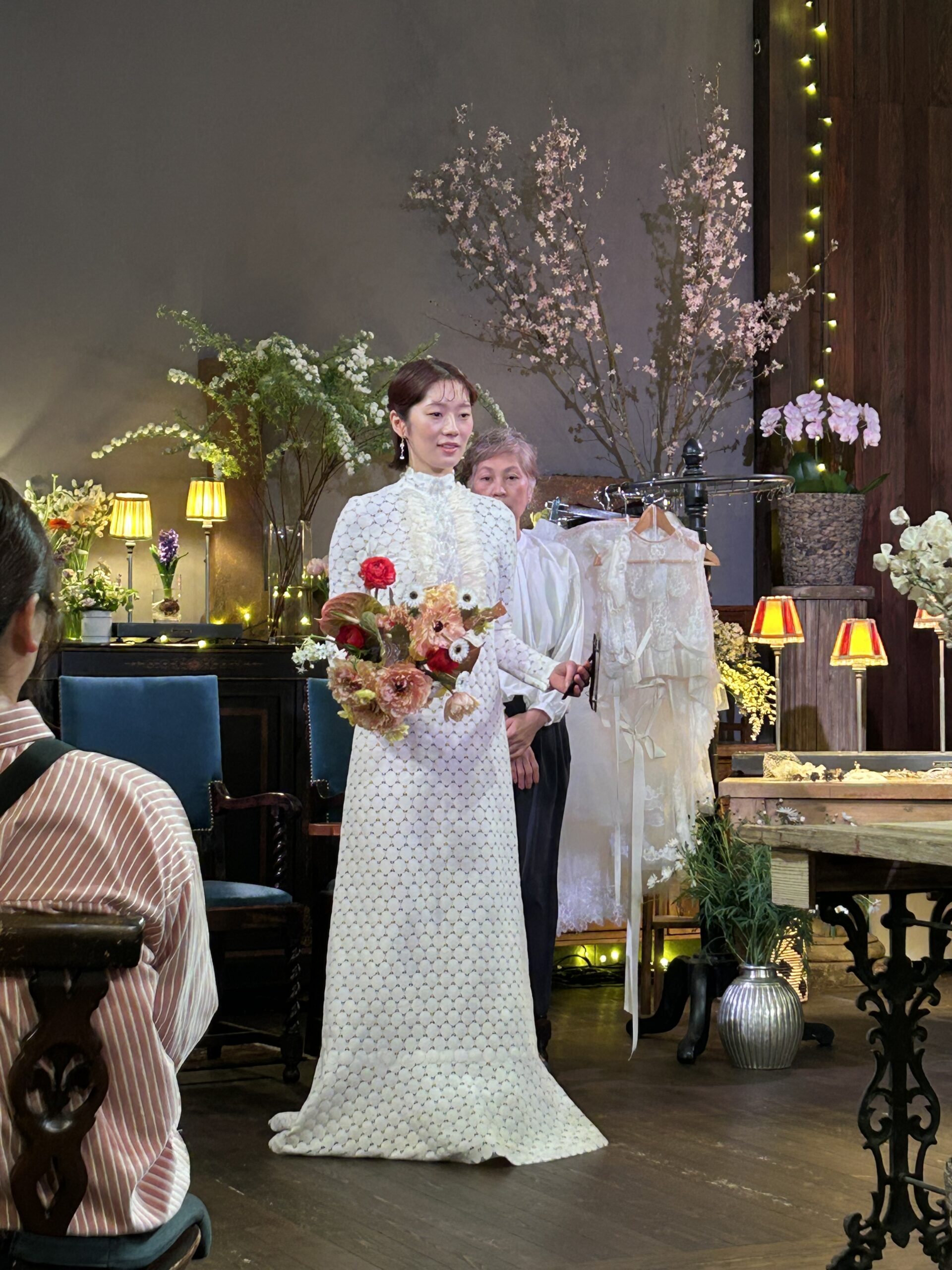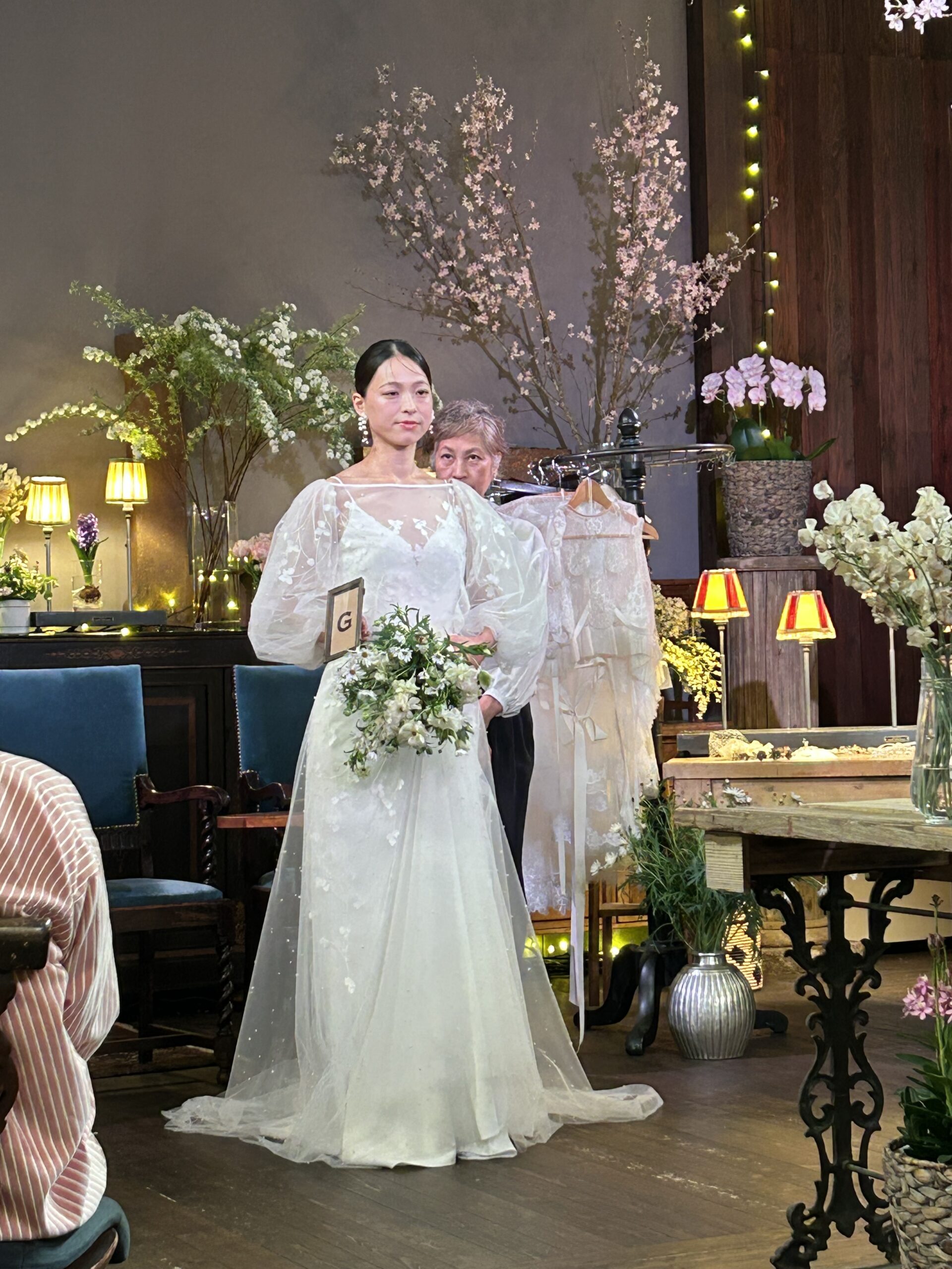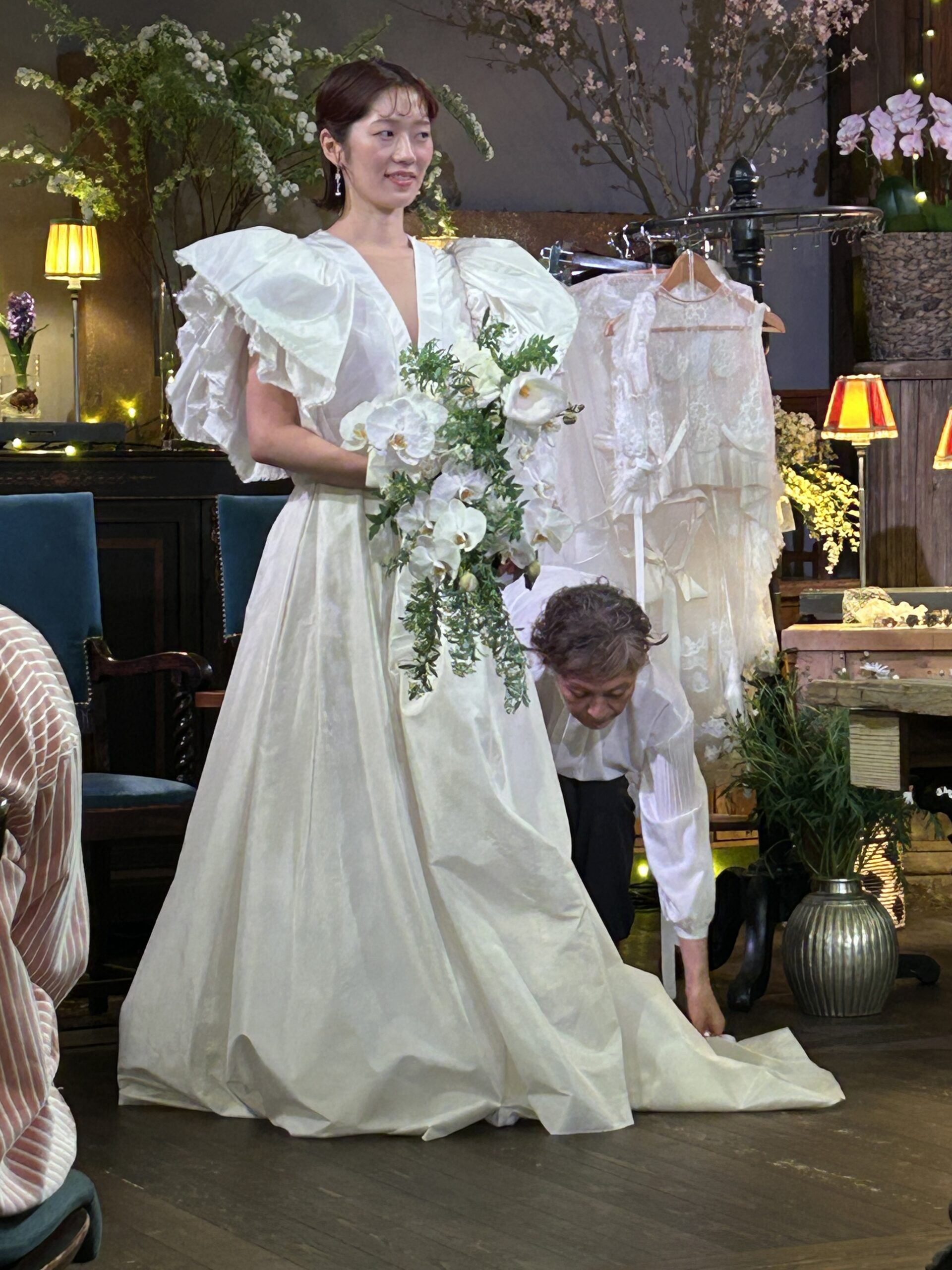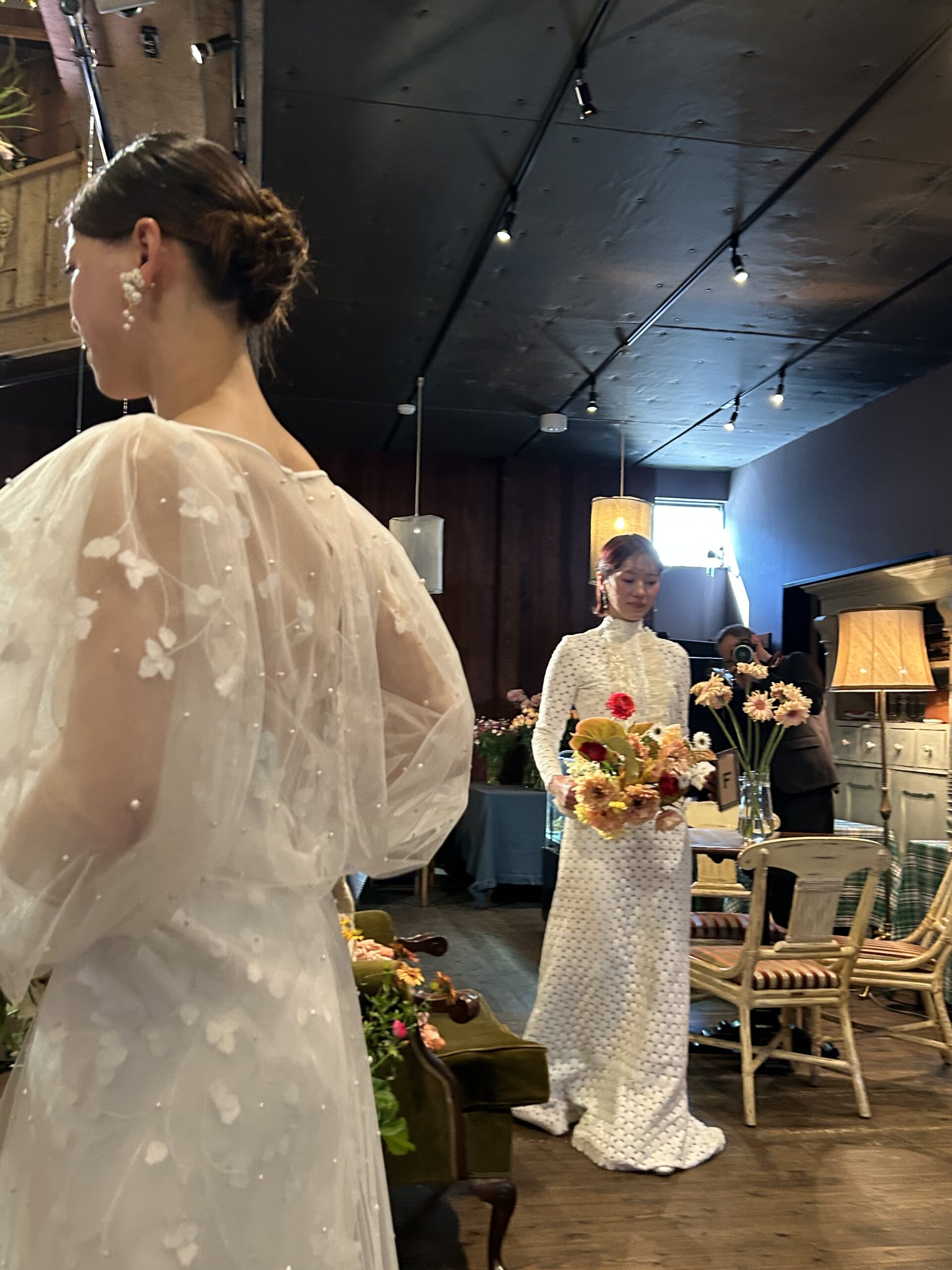 デザイナーYUKINORI MORINAGAさん来高でドレス紹介を聞きながら、お花に囲まれた華やかだけどシックでスタイリッシュなドレスばかり。さりげなく袖から見られる刺繍が綺麗で着る人を品よくスマートなシルエットを施していて圧巻💕💕💕