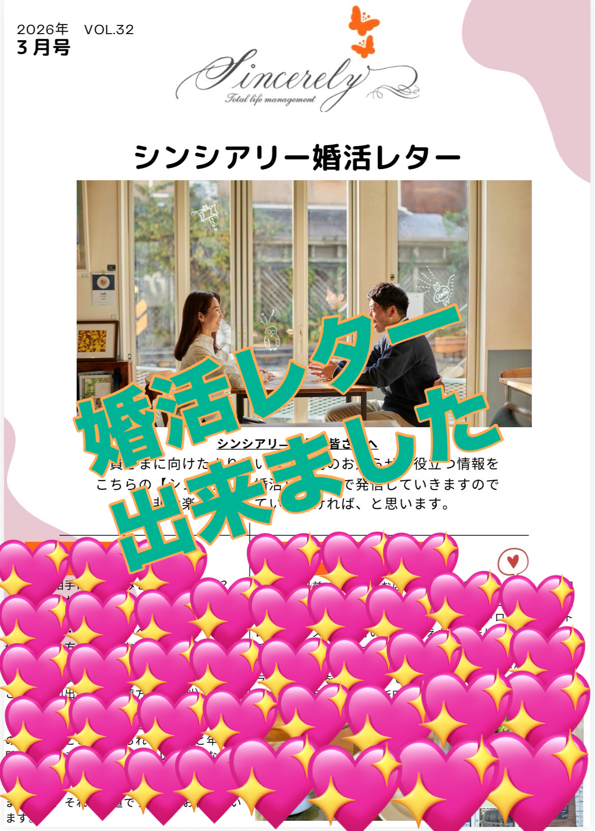 3月号の婚活レター出来ました 投稿日: 2026年3月13日 投稿者: yuko.t 3月号のシンシアリー婚活レターが出来ました。 楽しみにしてくださってる会員さまより、今月はまだですか?と、お問い合わせもいただいておりました。 今月も会員さまのお役にたてると嬉しいです。 Screenshot